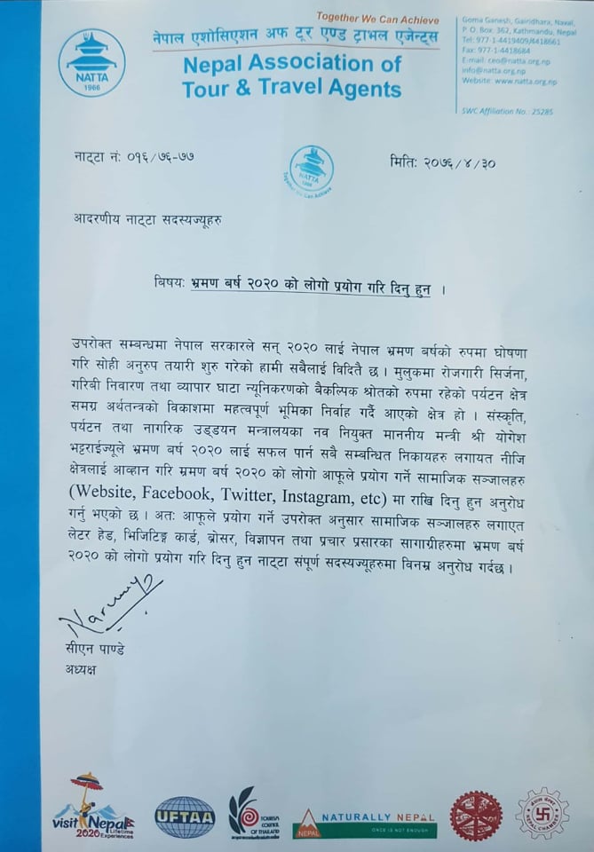 नेपाल एशोशियसन अफ टुर्स एण्ड ट्राभल एजेन्ट्स (नाट्टा) ले नेपाल भ्रमण वर्ष २०२० को लोगो आफ्ना सामाजिक सञ्जाल, लेटर हेड, भिजिटिङ कार्ड, ब्रोसर, विज्ञापन तथा प्रचार प्रसार सामाग्रीहरुमा प्रयोग