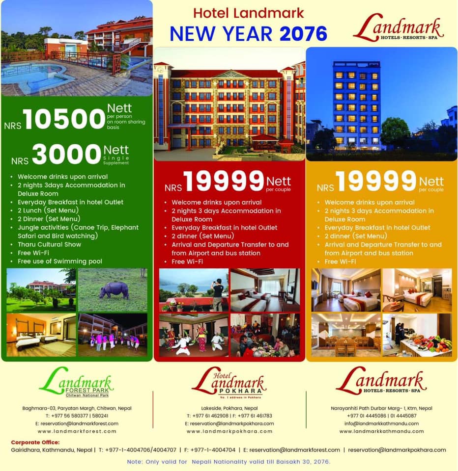 ल्याण्डमार्क फरेस्ट पार्क सौरहा चितवन तथा होटल ल्याण्डमार्क पोखरा र काठमाडौँले नयाँ वर्षको अवसरलाई लक्षित गरेर विभिन्न प्याकेज सार्वजनिक गरेको छ । नयाँ वर्ष २०७६ का लागि होटलले नेपालीहरूका
