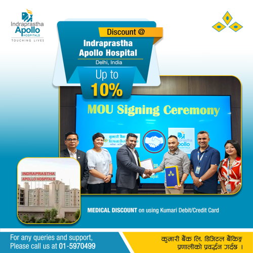 कुमारी बैंक लिमिटेडका ग्राहकले भारत नयाँदिल्लीमा रहेको इन्द्रप्रस्थ अपोलो हस्पिटल (इन्द्रप्रस्थ मेडिकल कर्पाेरेसन लिमिटेड) मा विशेष छुट पाउने भएका छन् ।